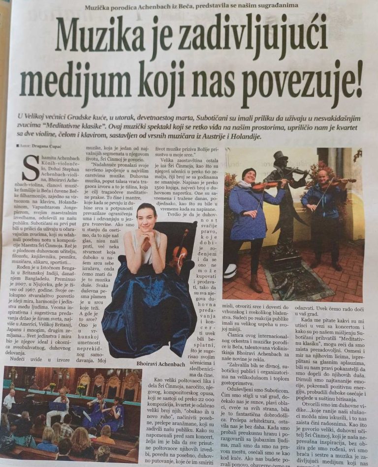 Shamita Achenbach Könih-violončelo, Dohai Stephan Achenbach-violina. Bhoiravi Achenbach-violina, članovi muzičke familije iz Beča i čuvene Bečke filharmonije, zajedno sa virtuozom na klaviru, Holanđaninom, Vapushtarom Jongepierom, svojim maestralnim izvedbama, oduševili su našu publiku. Subotičani su prvi put bili prilici da uživaju u očaravajućim zvucima, koji su udahnuli i posebnu notu u kompozicije Maestra Sri Činmoja. Reč je o plodnom duhovnom učitelju, filozofu, književniku, pesniku, muzičaru, slikaru, sportisti…