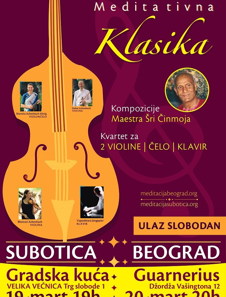 Koncert ’’Meditativna klasika’’ na impresivan način predstavlja kompozicije Maestra Šri Činmoja u zanimljivim i dinamičnim,velikanima klasične muzike nadahnutim, aranžmanima porodice Achenbach iz Austije. Razigrane tonove dve violine i čela upotpunjuje topli zvuk klavira.